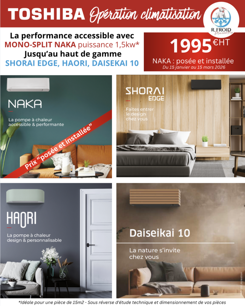 R. Froid Moncourtois vous accompagne dans votre projet de climatisation avec des tarifs avantageux sur toute la gamme TOSHIBA ✔️ NAKA – entrée de gamme…
